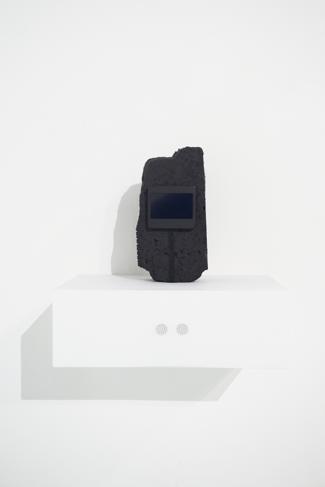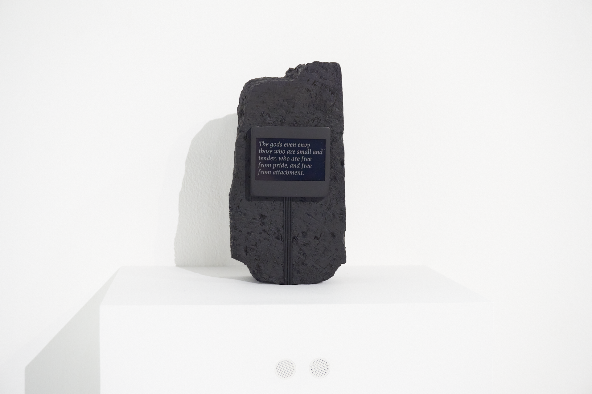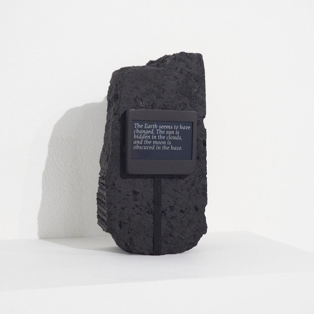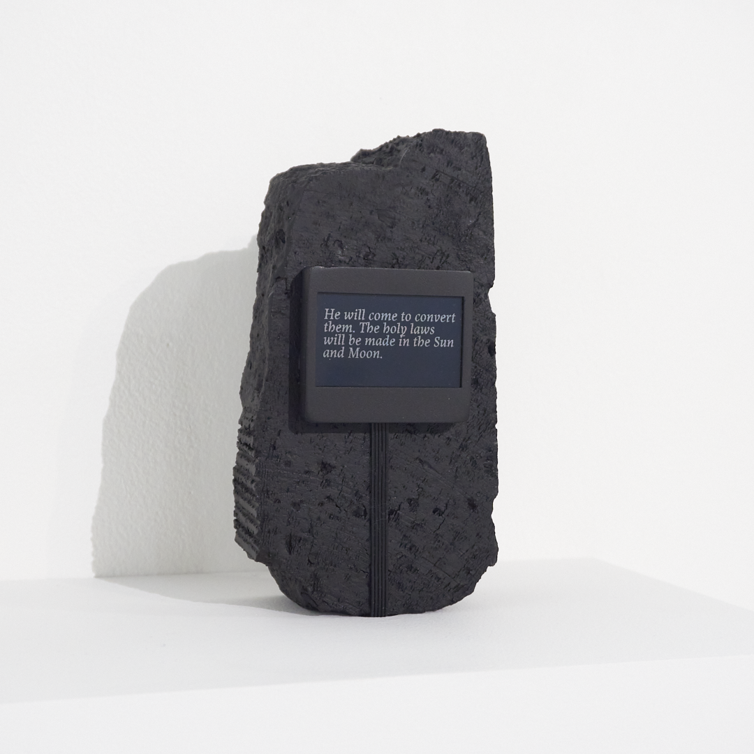 Watching machine learning continue to gain ubiquity and seep into every computational crack of society has me comparing these systems to religion. For this installation, I took the idea further by training a language model on ancient religious texts so that it could then form its own prophetic phrases. I built a physical system which would then dynamically render these generated words on a non-light-emitting display that is enshrined with a monolithic earth object. The system detects the presence of a participant using an ultrasonic sensor, triggering the display to show a new text.